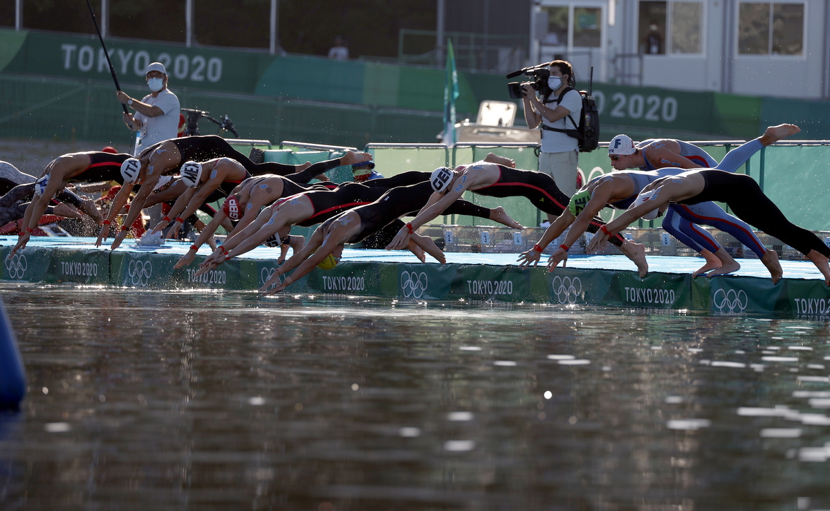 epa09395908 Competitors dive into the water at the start of the Men’s 10 kilometer Marathon Swimming event during the Marathon Swimming events of the Tokyo 2020 Olympic Games at the Odaiba Marine Park in Tokyo, Japan, 05 August 2021. EPA/JEON HEON-KYUN