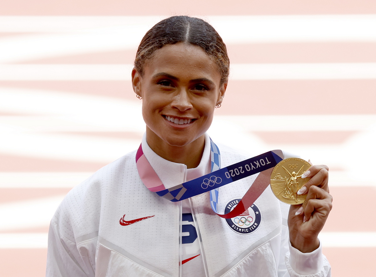 epa09393108 Gold medalist Sydney McLaughlin of the US reacts during the Women’s 400 Meter Hurdles victory ceremony during the Athletics events of the Tokyo 2020 Olympic Games at the Olympic Stadium in Tokyo, Japan, 04 August 2021. EPA/JEON HEON-KYUN