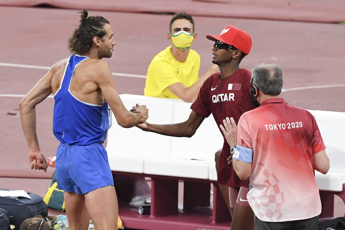 epa09385723 Gianmarco Tamberi of Italy (L) and Mutaz Essa Barshim of Qatar (2-R) celebrate as they share the first place and gold medal in the Men's High Jump Final during the Athletics events of the Tokyo 2020 Olympic Games at the Olympic Stadium in Tokyo, Japan, 01 August 2021. EPA/CIRO FUSCO