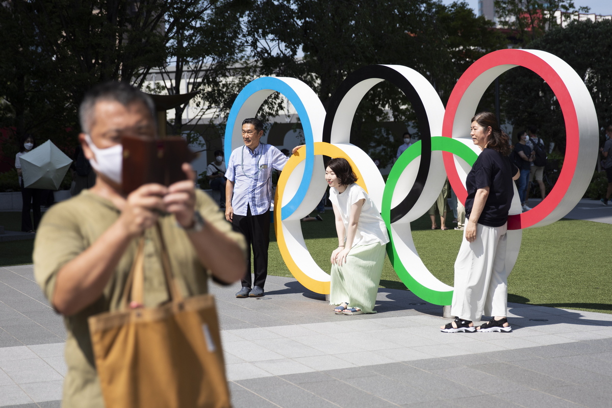epa09383828 People pose in front of the Olympic rings near the Olympic Stadium at the 2020 Tokyo Summer Olympics in Tokyo, Japan, 01 August 2021. EPA/PETER KLAUNZER EDITORIAL USE ONLY