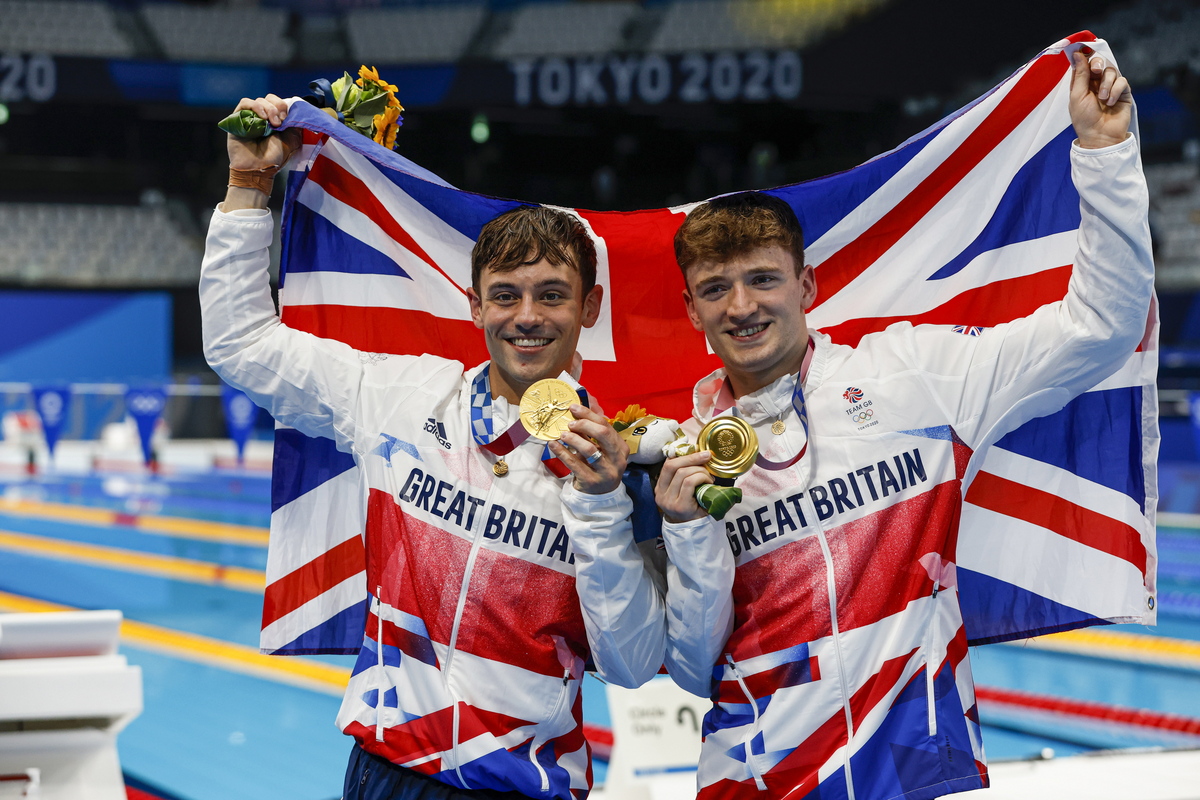 epa09366374 Thomas Daley (L) and Matthew Lee of Great Britain poses with their Gold medals and a British flag after winning the Men's 10m Synchro Platform Diving Semifinal during the Diving events of the Tokyo 2020 Olympic Games at the Tokyo Aquatics Centre in Tokyo, Japan, 26 July 2021. EPA/Patrick B. Kraemer