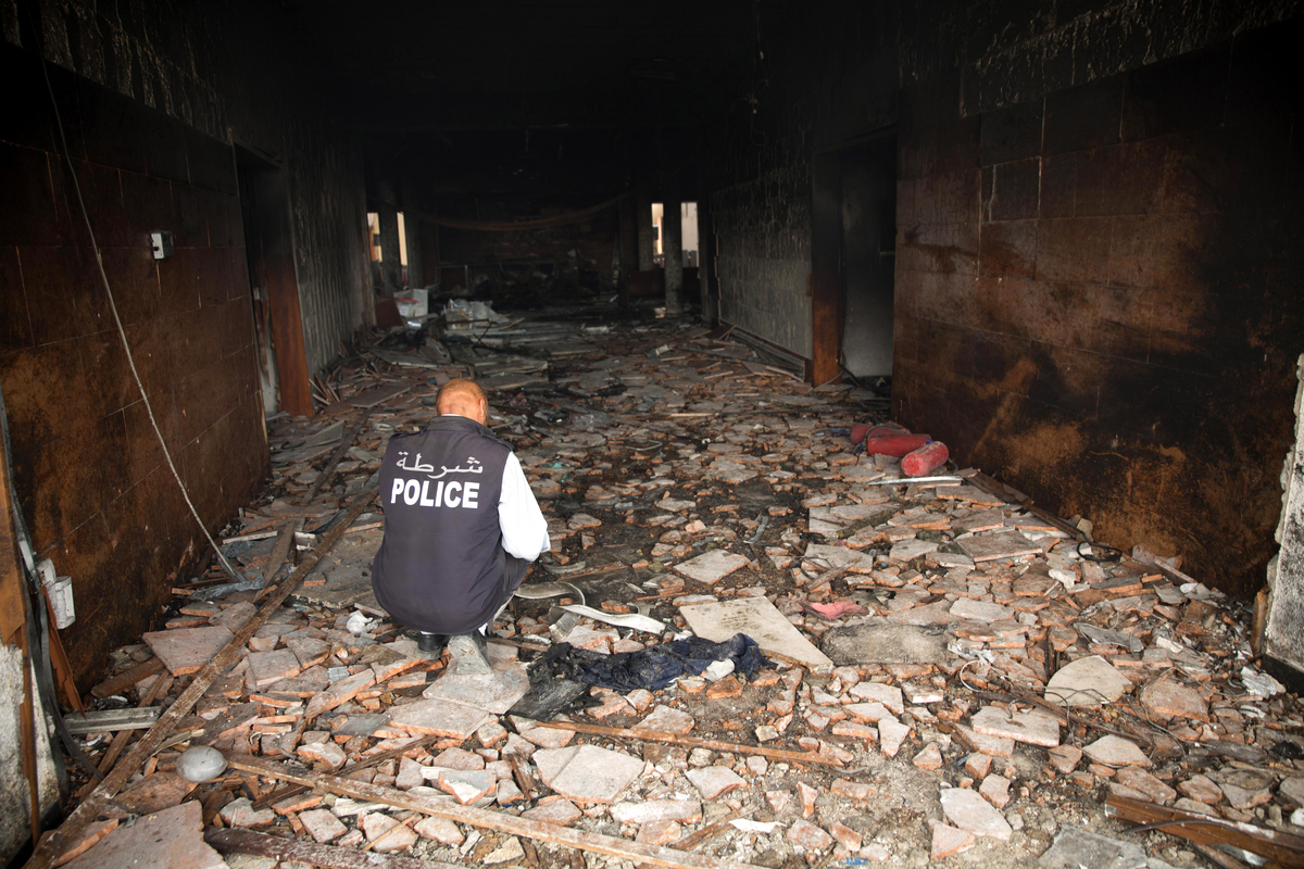 A policeman inspects the scene of a suicide attack at Libya's High National Election Commission (HNEC), Tripoli, Libya, 02 May 2018. According to reports, at least 12 people were killed and seven injured in an attack on the HNEC in Tripoli. The Islamic State (IS) claimed its responsibility for the attack. EPA/STR