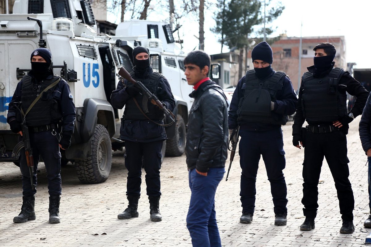 epa05101252 Policemen guard the scene after a bomb blast at the police headquarters of Cinar District, Diyarbakir, southeastern Turkey, 14 January 2016. A car bomb blast outside a police building in south-eastern Turkey killed at least five people, a news report said on 14 January, citing local officials. Civilians and police were among the dead, and 39 others were wounded in the explosion in the Cinar district of Diyarbakir province, Hurriyet daily newspaper reported, citing a statement from the provincial governor's office. Parts of Diyarbakir province have seen frequent clashes between government forces and Kurdish militants. EPA/STR