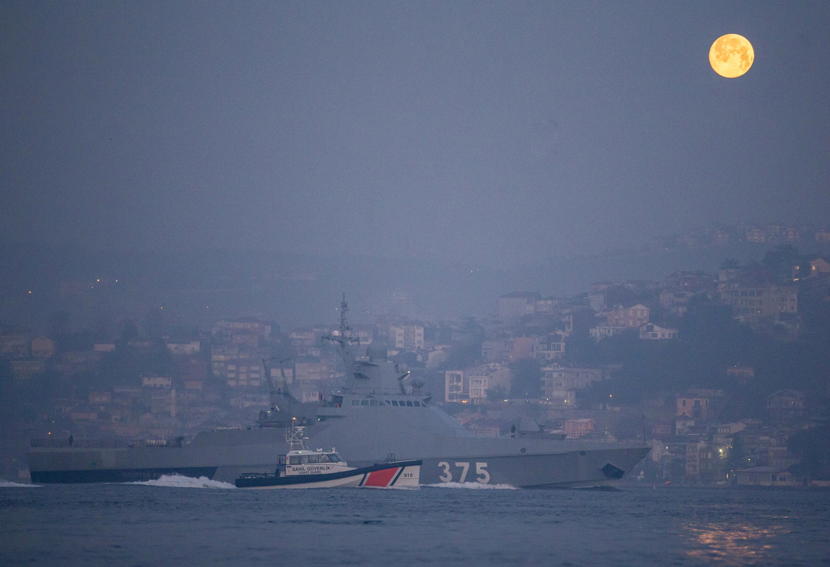 epa09760988 Russian Navy vessel Dmitry Rogachev 375 sails towards the Bosphorus at the Black Sea as an Turkish Coast Guard boat accompanies during full moon, in Istanbul, Turkey, 16 February 2022. Russian Navy ships transit the Black Sea for massive drills amid tensions between Russia and Ukraine. EPA/ERDEM SAHIN