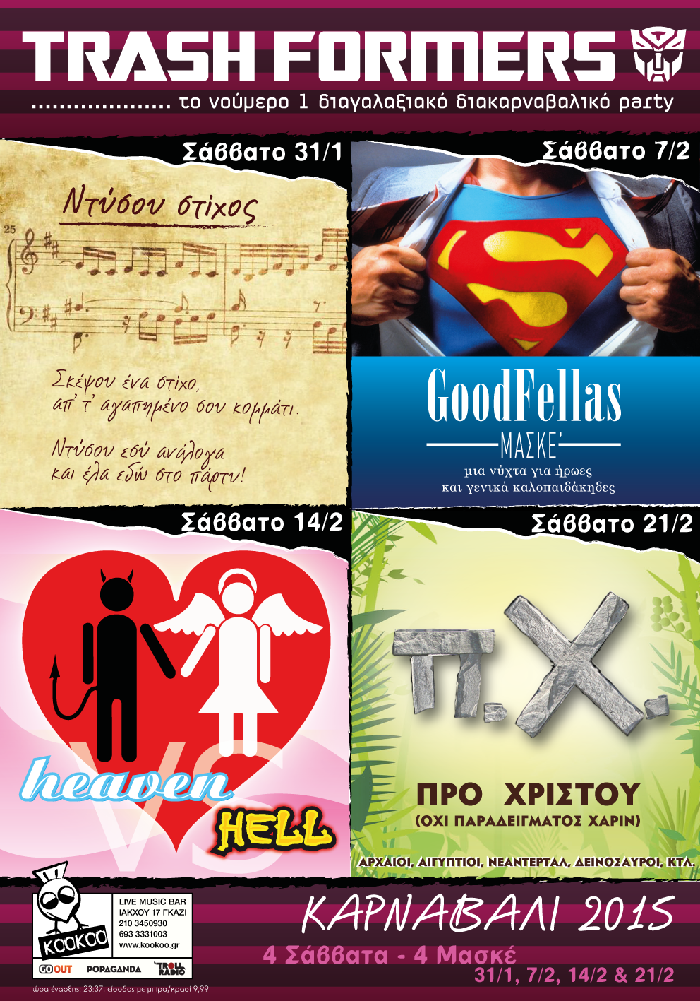 Σάββατο 31/1: ΝΤΥΣΟΥ ΣΤΙΧΟΣ. Φορέστε το αγαπημένο σας τραγούδι με τη μεγαλύτερη γλαφυρότητα κι αφήστε τη στολή σας να μιλήσει…ή μάλλον να τραγουδήσει. Διαλέξτε στίχο ή όνομα τραγουδιού (Ήρθες πάλι πίσω σαν το δολοφόνο, Μαύρα γυαλιά φοράω, Δέκα μάγισσες κλπ.- τα ονόματα εδώ αναφέρονται ενδεικτικά και όχι περιοριστικά), στείλτε μήνυμα με το όνομα του τραγουδιού από το οποίο αντλήσατε την έμπνευσή σας στους Trashformers για να σας προλογίσουν στην παρουσίαση και ετοιμαστείτε για τη μεγάλη ψηφοφορία. Μπορείτε άραγε να κάνετε το τραγούδι σας σουξέ;