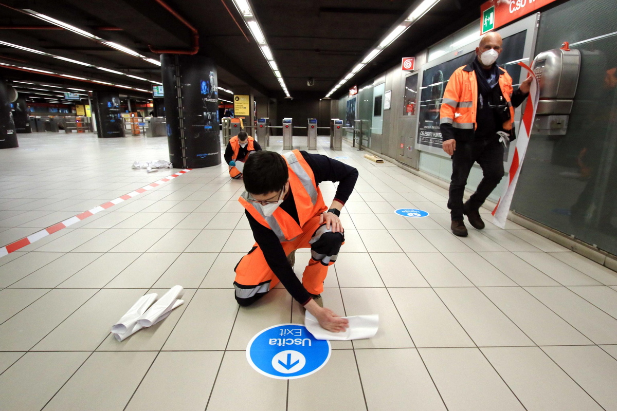 Υπάλληλοι του μετρό του Μιλάνου, που φορούν προστατευτικές μάσκες προσώπου εγκαθιστούν νέα σήμανση στις αποβάθρες, για να διαχειριστούν τη ροή των επιβατών και να διασφαλίσουν ότι διατηρείται η ελάχιστη απόσταση ασφαλείας μεταξύ των μετακινομένων. Ιταλία, 2 Μαΐου 2020. EPA / PAOLO SALMOIRAGO