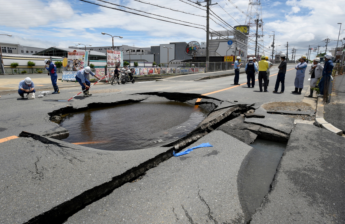 epa06817617 Workers check damage of a road collapsed by an earthquake in Takatsuki, Osaka Prefecture, western Japan, 18 June 2018. The earthquake, which struck western Japan, killed three people injured more than 50. EPA/JIJI PRESS EDITORIAL USE ONLY/NO ARCHIVE/JAPAN OUT EDITORIAL USE ONLY