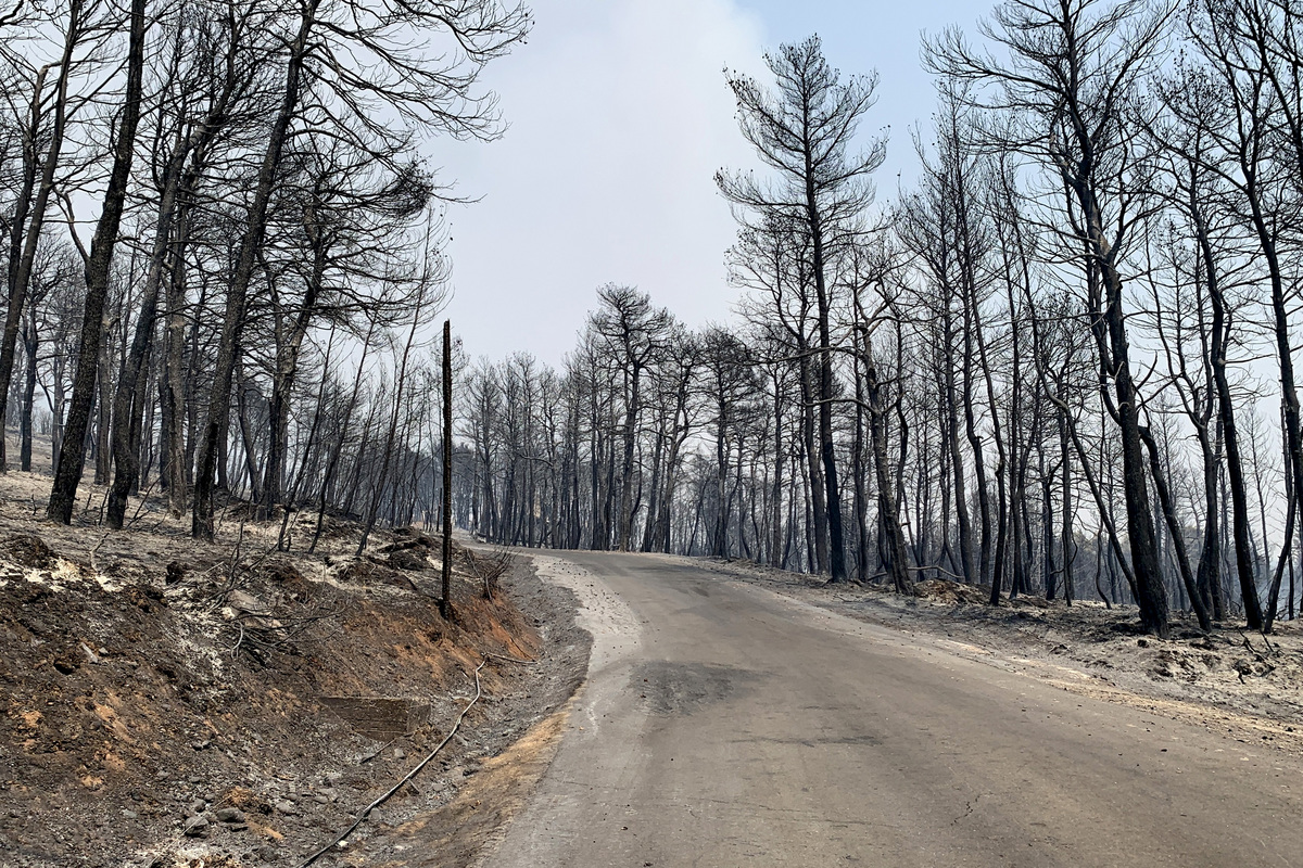 Kαμένη έκταση στο χωριό Ροβιές στη βόρεια Εύβοια, την Πέμπτη 5 Αυγούστου 2021. Δύσκολη είναι η κατάσταση στη βόρεια Εύβοια και στην Ολυμπία από τις μεγάλες πυρκαγιές που έχουν προκαλέσει τεράστιες καταστροφές και συνεχίζουν να απειλούν χωριά και οικισμούς, κάνοντας παράλληλα αποπνικτική και αφόρητη την κατάσταση, ενώ σε πλήρη εξέλιξη είναι και η πυρκαγιά στη Μεσσηνία. Στην Εύβοια εγκατέλειψαν το χωριό Κεχριές οι κάτοικοι, στις 07:00, καθώς το τεράστιο μέτωπο που δεν μπορεί να σταματήσει με τίποτα, έχει φτάσει σε απόσταση αναπνοής από τα σπίτια. Οι κάτοικοι ειδοποιήθηκαν να εγκαταλείψουν τα σπίτια με τις καμπάνες και από ένα περιπολικό της αστυνομίας που έσπευσε εκεί και έφυγαν με δικά τους μέσα για ασφαλή σημεία, ενώ οι φλόγες συνεχίζουν να πλησιάζουν χωρίς να μπορεί κανείς να τις εμποδίσει. Εστάλη και επισήμως μήνυμα μέσω του 112 προς τους κατοίκους των Κεχριών να εγκαταλείψουν την περιοχή και να κατευθυνθούν προς το Μαντούδι. Επίσης στην Εύβοια, όπου η κατάσταση είναι η πιο ανησυχητική, τη νύχτα εκκενώθηκαν και πάλι οι οικισμοί Κουρκουλοί, Σκεπαστή, καθώς και Αμέλαντες και Κεράμια.