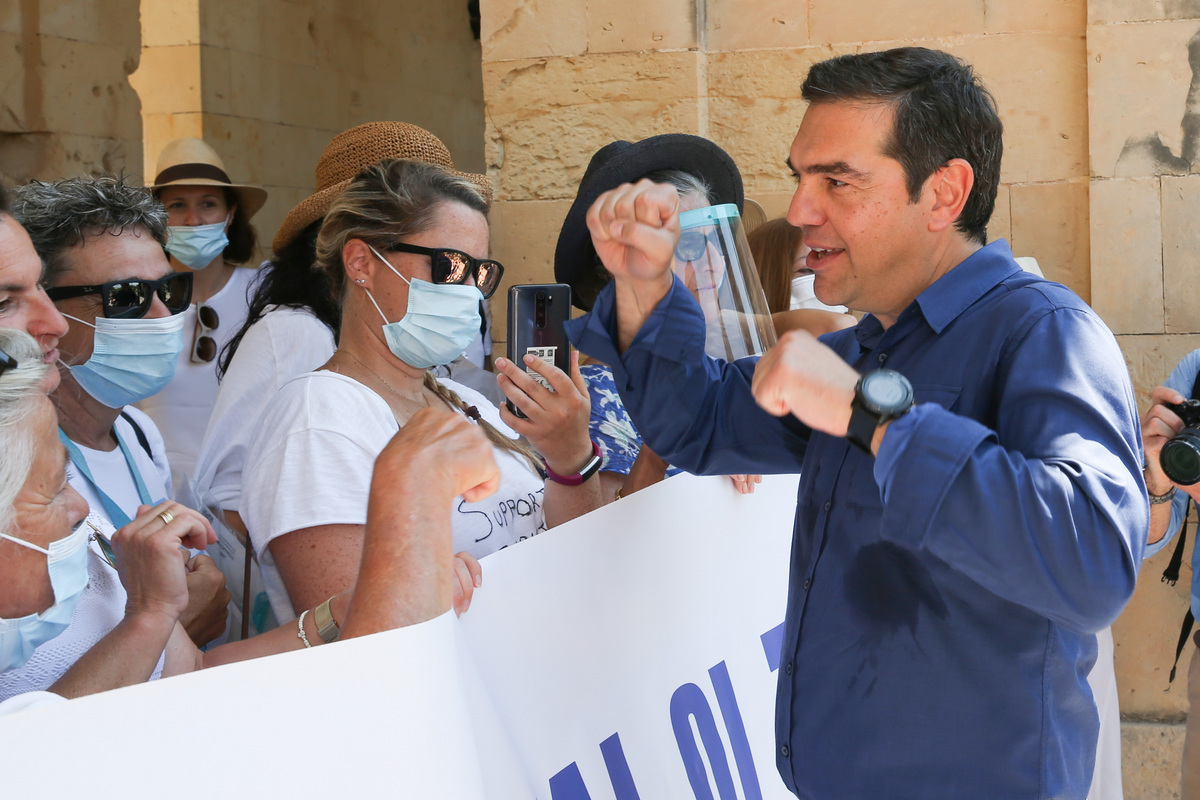 Ο πρόεδρος του ΣΥΡΙΖΑ Αλέξης Τσίπρας (Δ) μιλάει με ξεναγούς που πραγματοποιούν συγκέντρωση διαμαρτυρίας, κατά την επίσκεψή του στην Κέρκυρα, Πέμπτη 02 Ιουλίου 2020. ΑΠΕ-ΜΠΕ/ΑΠΕ-ΜΠΕ/ΣΤΑΜΑΤΗΣ ΚΑΤΑΠΟΔΗΣ