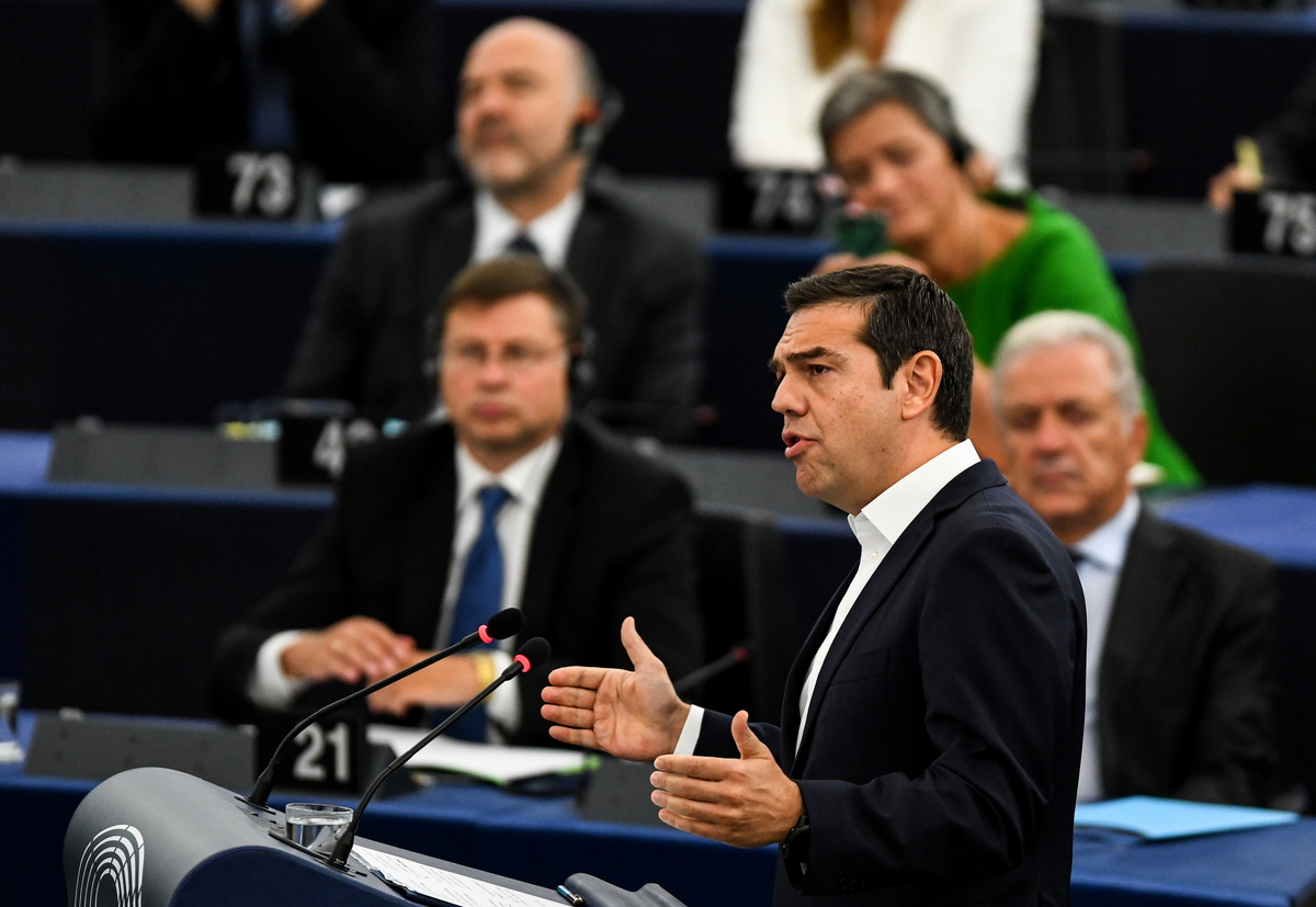 epa07011797 Greek Prime Minister Alexis Tsipras delivers his speech during the plenary session at the European Parliament in Strasbourg, France, 11 September 2018. Tsipras is in Strasbourg to debate the future of the European Union with the Members of Parliament. EPA/PATRICK SEEGER