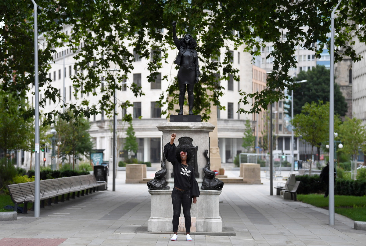 epa08546668 Protester Jen Reid with a raised fist poses in front of a depiction of herself, the statue 'A Surge of Power (Jen Reid)' by British artist Marc Quinn, which stands on the vacant plinth where a statue of Edward Colston stood, in Bristol, Britain, 15 June 2020. Marc Quinn erected a statue of a black female protester, who had climbed up on the pedestal and stood there with her arm raised, after Colston's statue was torn down in response to the killing of unarmed George Floyd whilst in the custody of US police. EPA/NEIL HALL