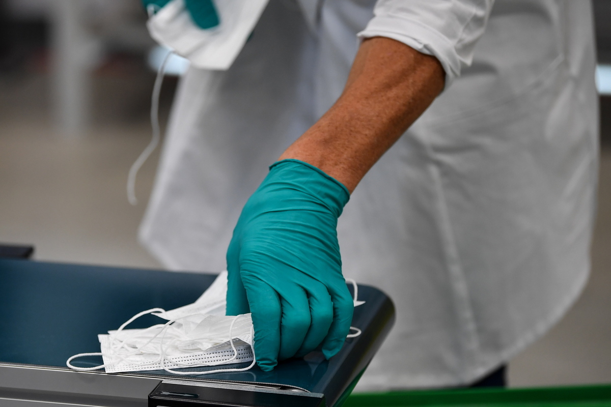 epa08407737 A worker operates a prototype of an automated face mask production line at the Bavarian robotics company PIA in Amberg, Germany, 07 April 2020. In its efforts to control the ongoing pandemic of the COVID-19 disease caused by the SARS-CoV-2 coronavirus, Germany is aiming to produce more protective equipment domestically. EPA/PHILIPP GUELLAND