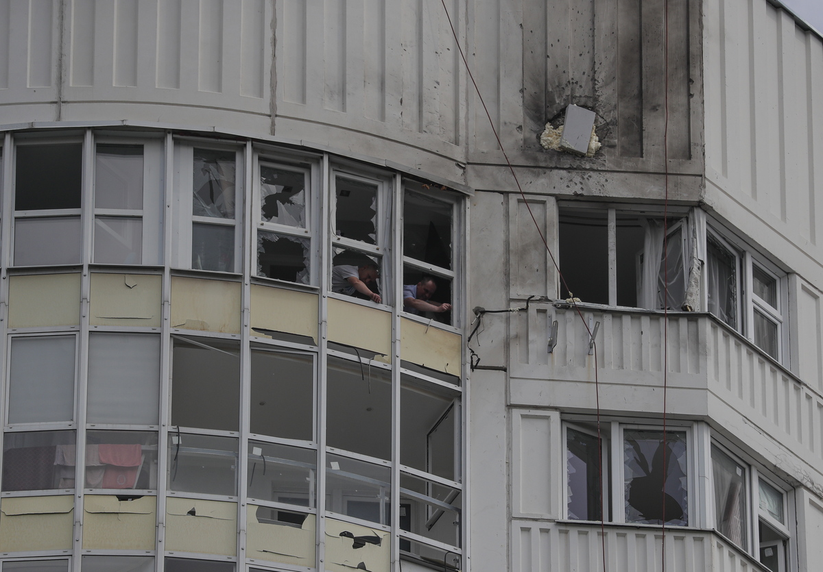 epa10662990 Russian investigators work in damaged apartment in a residential building following a reported drone attack in Moscow, Russia, 30 May 2023. An unmanned aerial vehicle (UAV) attack caused 'minor' damage to several buildings and no serious injuries following a drone strike in the Russian capital, Moscow Mayor Sergei Sobyanin wrote on telegram. 'This morning, the Kyiv regime launched a terrorist attack with unmanned aerial vehicles on facilities in the city of Moscow', said the Russian Defence Ministry blaming the attack on Ukraine. The Russian military intercepted eight drones targeting facilities in the city of Moscow, the defense ministry added. EPA/MAXIM SHIPENKOV