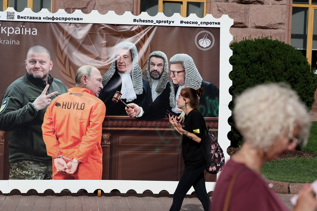epa10815142 People walk past a poster depicting Russian President Vladimir Putin being brought as a prisoner before the International Court of Justice in The Hague by Ukrainian general Valery Zaluzhnyi, as damaged Russian armored military vehicles (not pictured) that were seized by the Ukrainian army amid the Russian invasion are exhibited along Khreshchatyk Street in Kyiv (Kiev), Ukraine, 23 August 2023. The damaged Russian military machinery was set up in downtown Kyiv prior to the upcoming Independence Day celebrations on 24 August. EPA/CATHAL MCNAUGHTON