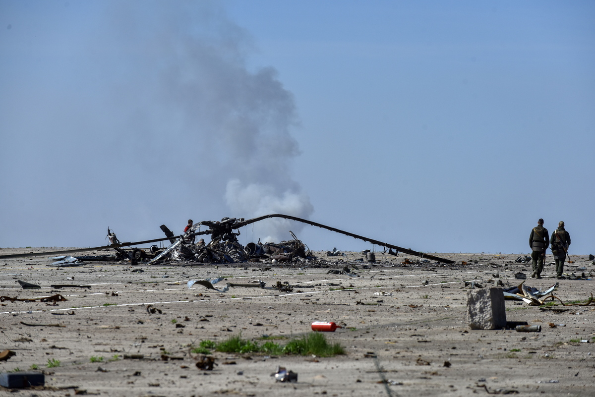 epaselect epa09928464 A picture taken during a trip organized by the Ukrainian interior ministry showing Ukrainian servicemen near the remains of a Russian helicopter at the Gostomel airfield near Kyiv (Kiev), Ukraine, 05 May 2022. On 24 February, Russian troops had entered Ukrainian territory in what the Russian president declared a 'special military operation', resulting in fighting and destruction in the country, a huge flow of refugees, and multiple sanctions against Russia. EPA/OLEG PETRASYUK