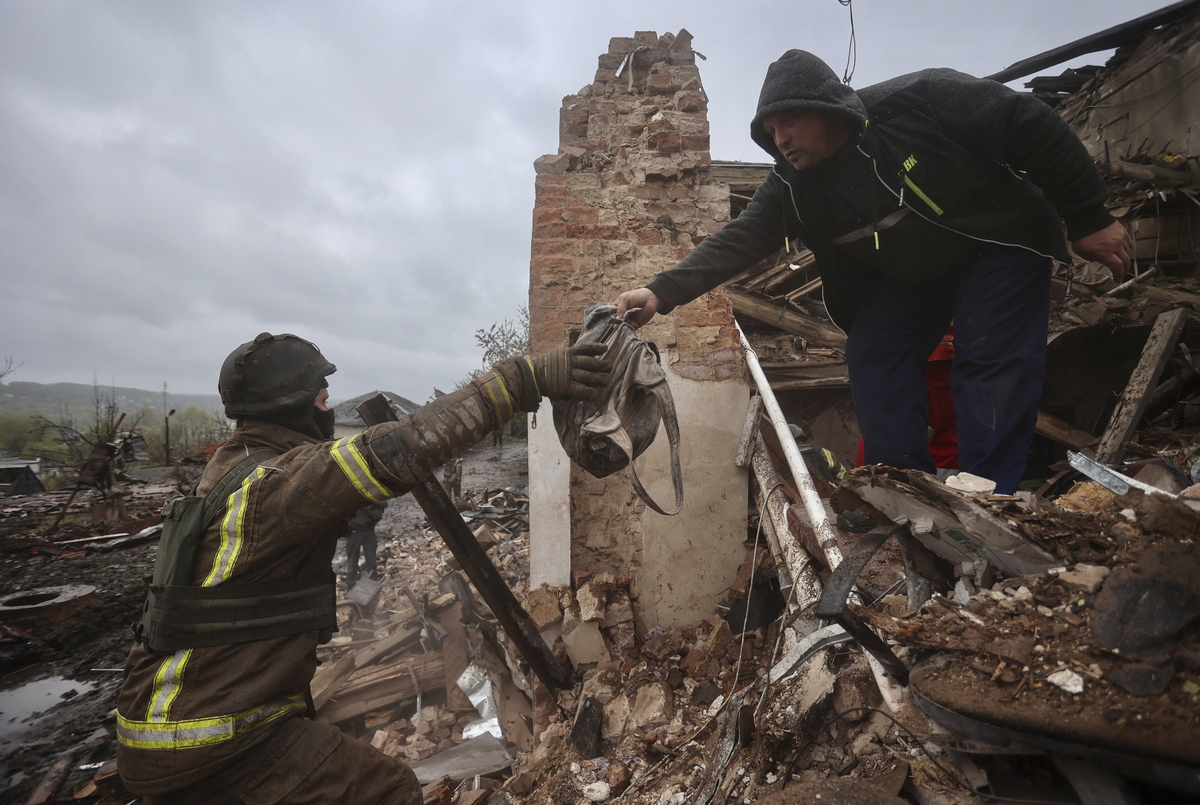 epa10591016 Ukrainian rescuers recover belongings among the debris after a rocket attack on the local history museum in the city of Kupiansk, Kharkiv region, northeastern Ukraine, 25 April 2023, amid Russia's invasion. At least two persons were killed and 10 others injured in the attack, the State Emergency Service of Ukraine reported. Russian troops entered Ukrainian territory in February 2022, starting a conflict that has provoked destruction and a humanitarian crisis. EPA/STRINGER