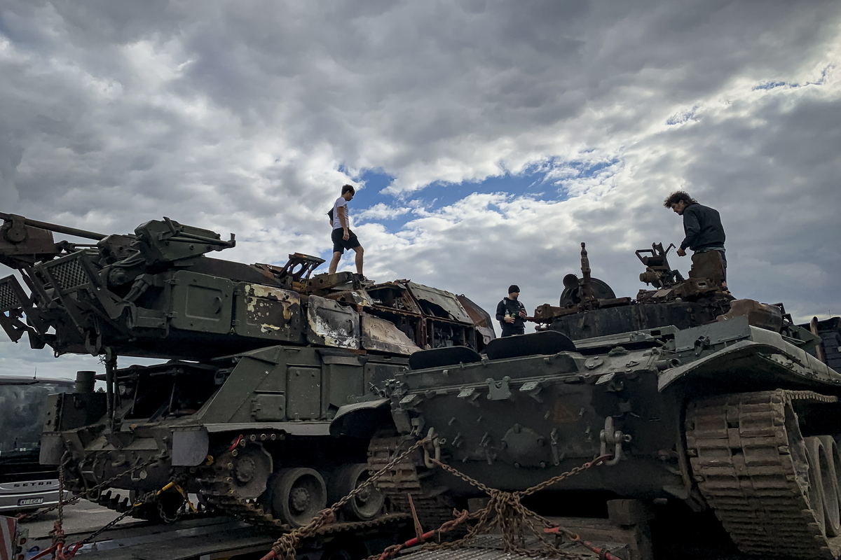 epa10064216 Men stand on a Russian military equipments which were destroyed in fights with the Ukrainian army, placed for exhibition on a truck, in Prague, Czech Republic, 10 July 2022. The opening of the exhibition of defused military equipment of the Russian army will take place on 11 July, according to Ukrainian embassy in Czech Republic. EPA/MARTIN DIVISEK