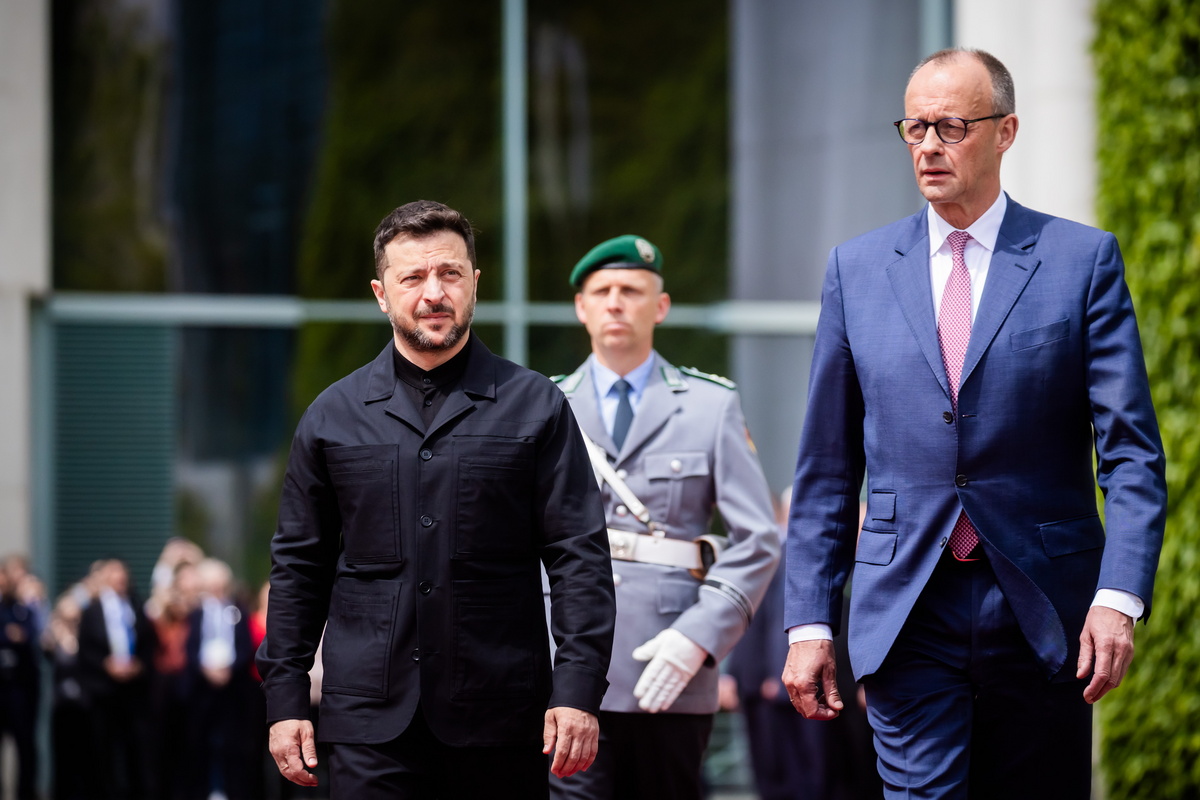 epa12140243 German Chancellor Friedrich Merz (R) welcomes Ukrainian President Volodymyr Zelensky (L) with military honors at the Chancellery in Berlin, Germany, 28 May 2025. EPA/CHRISTOPH SOEDER