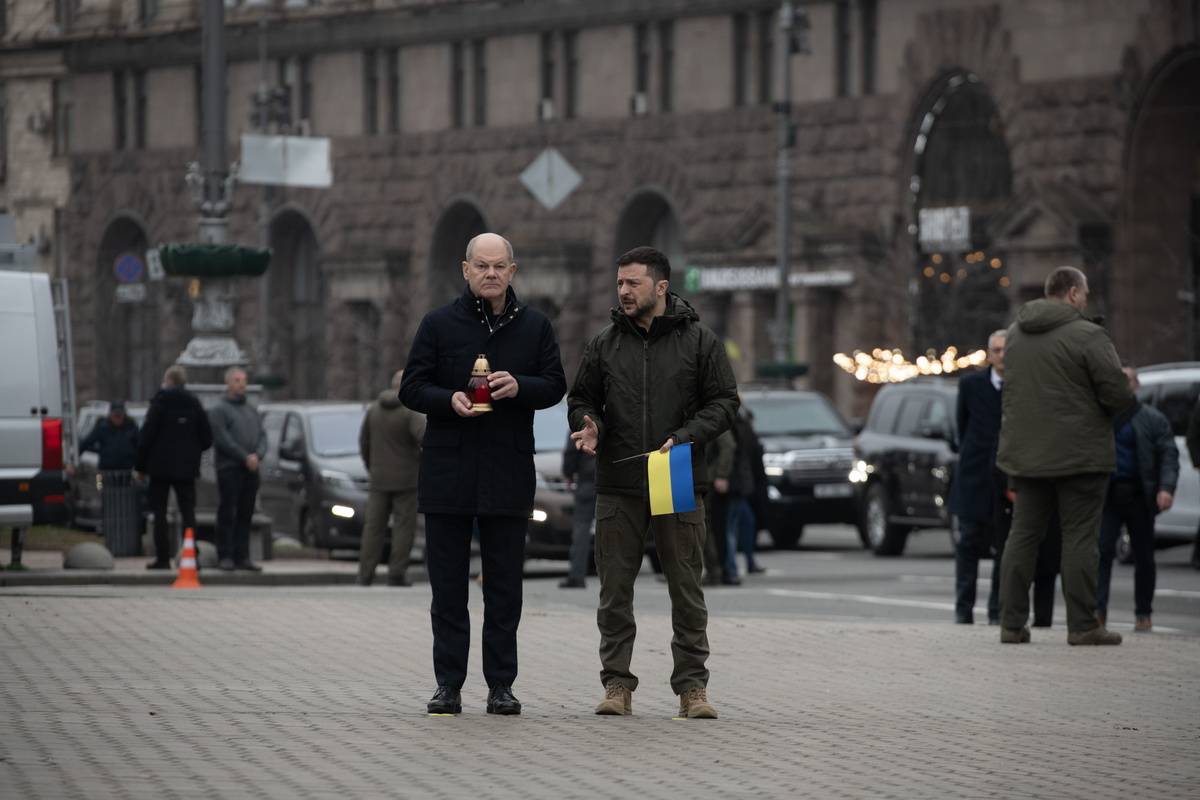 epaselect epa11752982 German Chancellor Olaf Scholz (L) and Ukraine’s President Volodymyr Zelenky (R) arrive to visit the memorial to the fallen at Independence Square in Kyiv, Ukraine, 02 December 2024, amid the Russian invasion. EPA/MAXYM MARUSENKO