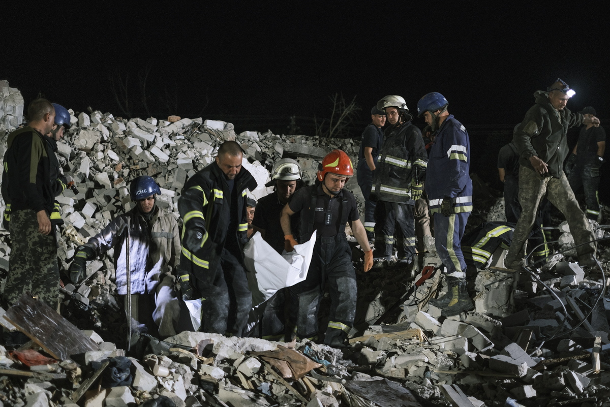epa10064825 Ukrainian rescuers extract a body from a residential building damaged by shelling in the town of Chasiv Yar, Donetsk region, eastern Ukrane, late 10 July 2022 (issued 11 July 2022). At least 19 people were killed as a result of a Russian missile strike on a five-story residential building on 09 July, Ukraine's State Emergency Services said on 11 July. Russian troops on 24 February entered Ukrainian territory, starting a conflict that has provoked destruction and a humanitarian crisis. EPA/GEORGE IVANCHENKO