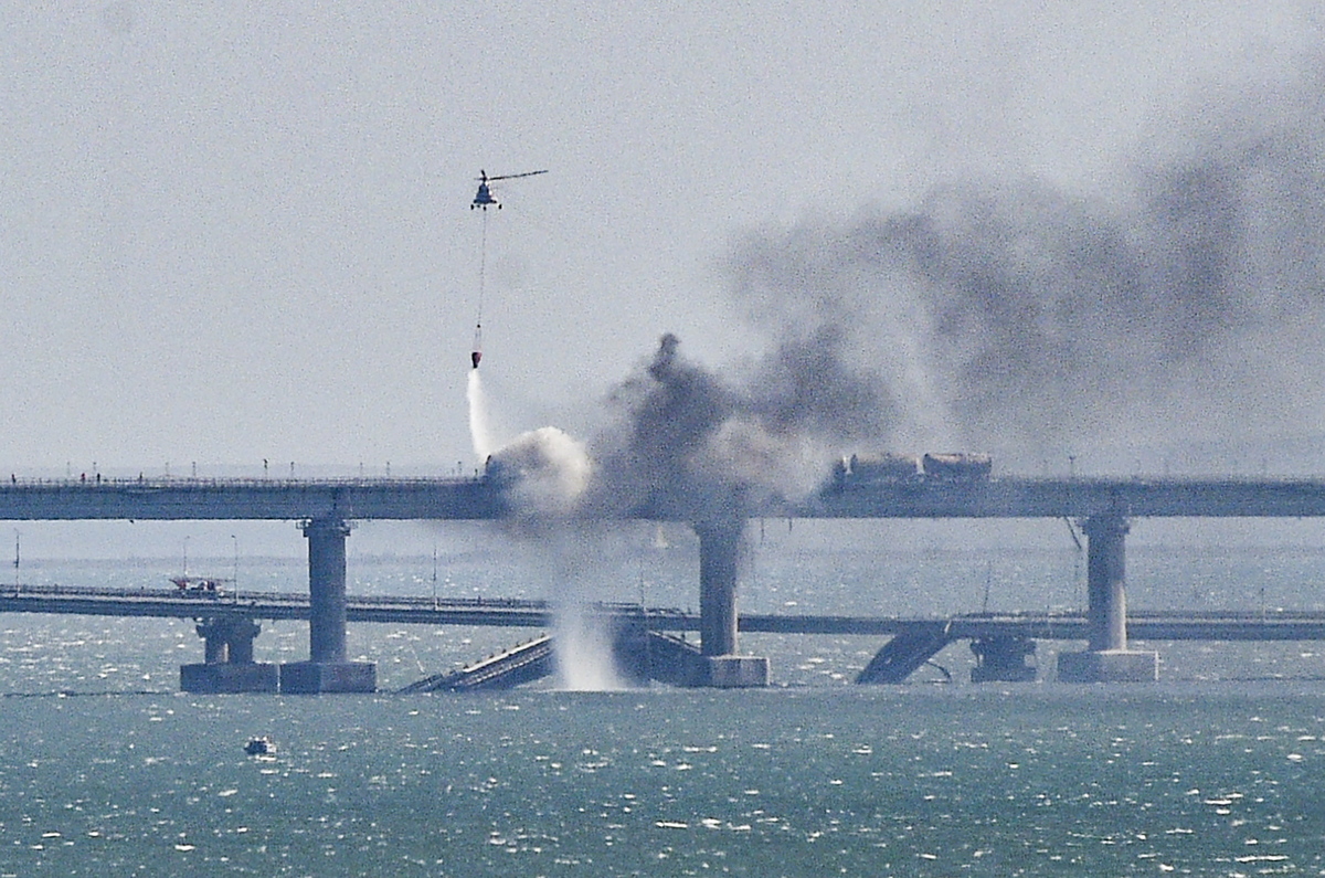 epaselect epa10230640 A firefighter helicopter pours water on fire on a collapsed part of the Kerch Strait bridge in Crimea, 08 October 2022. According to Russian authorities, "an explosion was set off at a cargo vehicle on the motorway part of the Crimean bridge on the side of the Taman peninsula, which set fire to seven fuel tanks of a train that was en route to the Crimean peninsula. Two motorway sections of the bridge partially collapsed." EPA/STRINGER