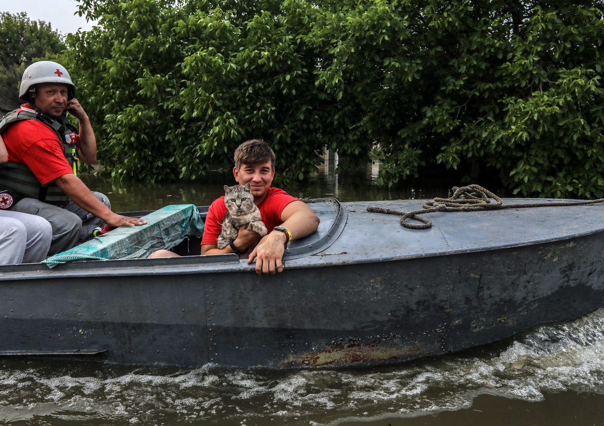 Οι διασώστες αγωνίζονται για να σώσουν χιλιάδες ζώα που έχουν εγκλωβιστεί μετά τις πλημμύρες στην πόλη Χερσώνα της νότιας Ουκρανίας που προκλήθηκαν από την καταστροφή του τεράστιου φράγματος της Καχόβκα.