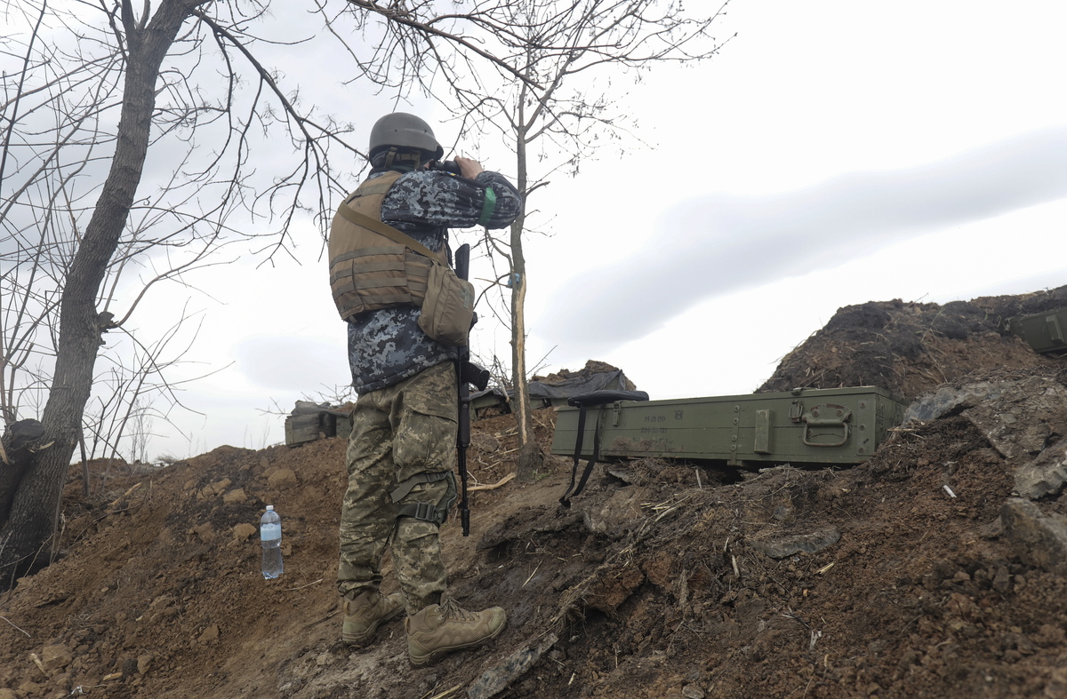 epa09896209 A Ukrainian serviceman takes a position in a zone between Luhansk and Donetsk areas, Ukraine, 18 April 2022, amid increasing Russian troops activity. Russian troops entered Ukraine on 24 February resulting in fighting and destruction in the country and triggering a series of severe economic sanctions on Russia by Western countries. EPA/STR