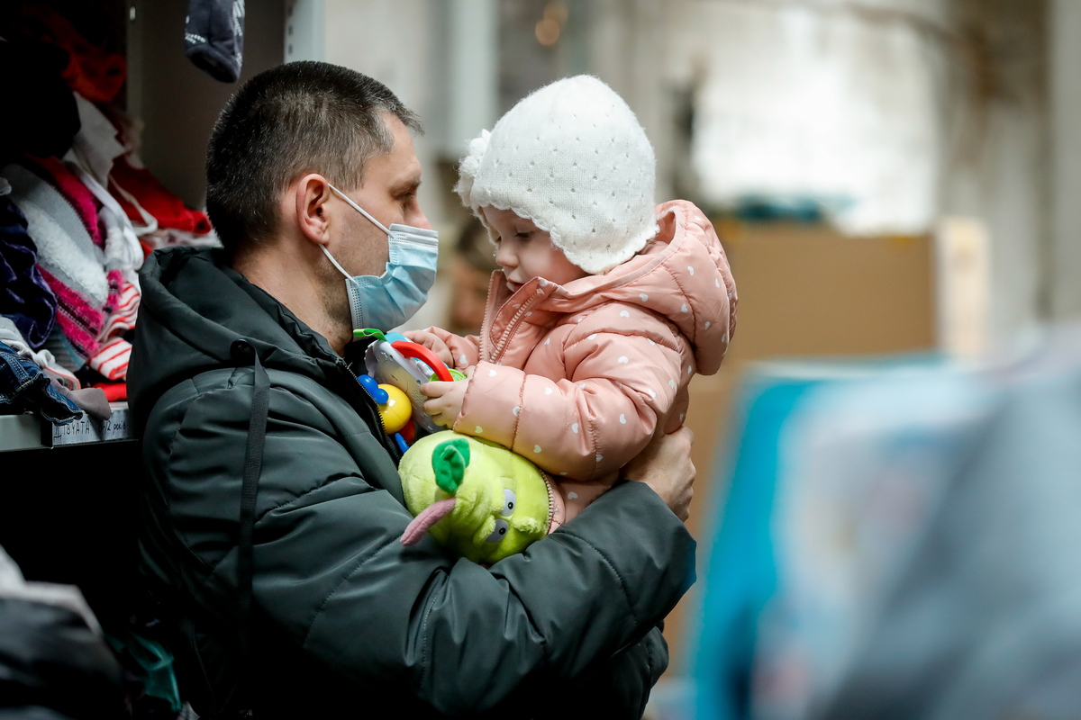epa09878584 A father and her daughter choose clothes in a collection and distribution point for Ukrainian refugees in Brussels, Belgium, 08 April 2022. A food and clothing distribution point has opened in Brussels for Ukrainian refugees. It is open Monday to Saturday from 10 a.m. to 7 p.m. local time. EPA/STEPHANIE LECOCQ