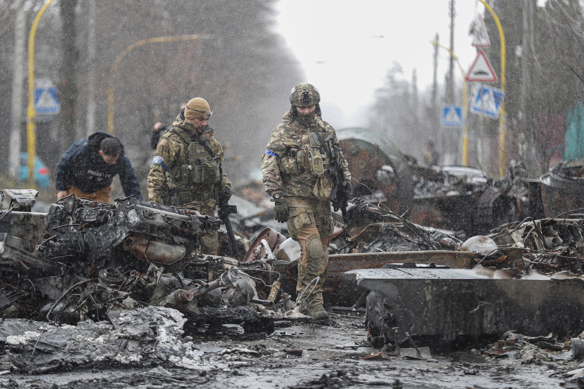 epaselect epa09868083 Ukrainian Soldiers inspect destroyed Russian military machinery in the city of Bucha, Ukraine, 03 April 2022, one of the areas recaptured by the Ukrainian army from Russian forces. On 24 February, Russian troops had entered Ukrainian territory in what the Russian president declared a 'special military operation', resulting in fighting and destruction in the country, a huge flow of refugees, and multiple sanctions against Russia EPA/ATEF SAFADI