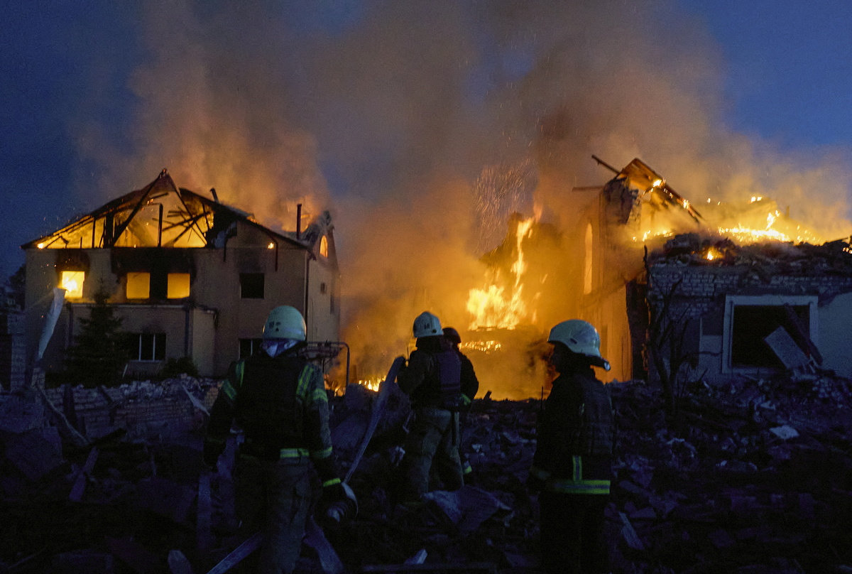 epa11330778 Ukrainian rescuers work to extinguish a fire at the site of an overnight missile strike on private buildings in Kharkiv, northeastern Ukraine, 10 May 2024, amid the Russian invasion. Kharkiv was hit by an S-300 missile at night, Mayor Ihor Terekhov wrote on telegram. At least two people, a 11-year-old child and a 72-year-old woman, were injured in the attack, according to the head of the Kharkiv Regional Military Administration, Oleg Synegubov. Russian troops entered Ukrainian territory on 24 February 2022, starting a conflict that has provoked destruction and a humanitarian crisis. EPA/SERGEY KOZLOV
