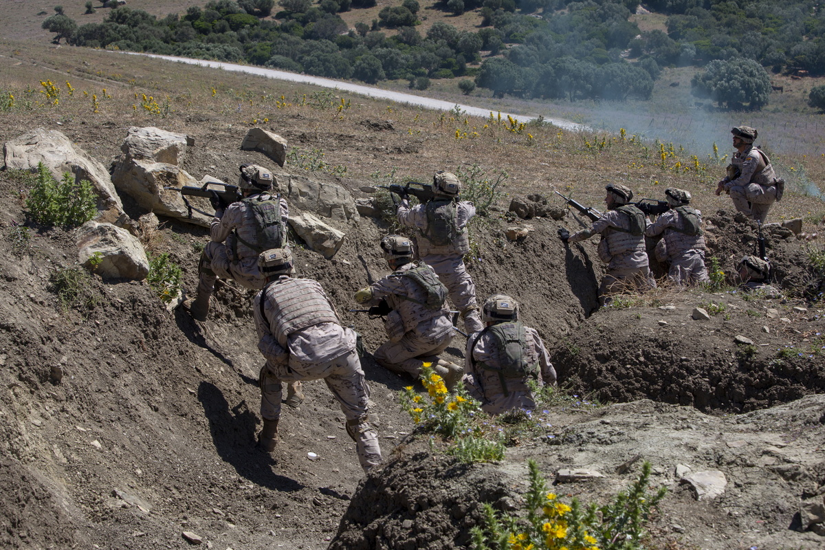 epa11345538 Ukrainian soldiers take part in military maneuvers at the Sierra del Retin training camp of the Spanish Army in Barbate town, Cadiz province, southern Spain, 16 May 2024. A group of 80 Ukrainian military personnel get in this camp basic military instruction, from combat shooting to throwing grenades from trenches, within the framework of the Military Assistance Mission of the European Union in Support of Ukraine (EUMAM UA). EPA/ROMAN RIOS