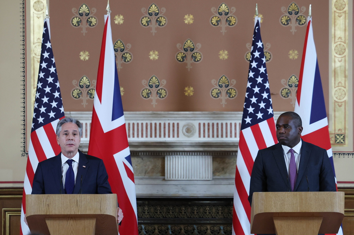 epa11596222 US Secretary of State Antony Blinken (L) and Britain's Foreign Secretary David Lammy (R) hold a press conference as part of a strategic dialogue at the Foreign, Commonwealth and Development Office in London, Britain, 10 September 2024. Blinken is visiting the UK as part of a strategic dialogue visit. EPA/NEIL HALL / POOL