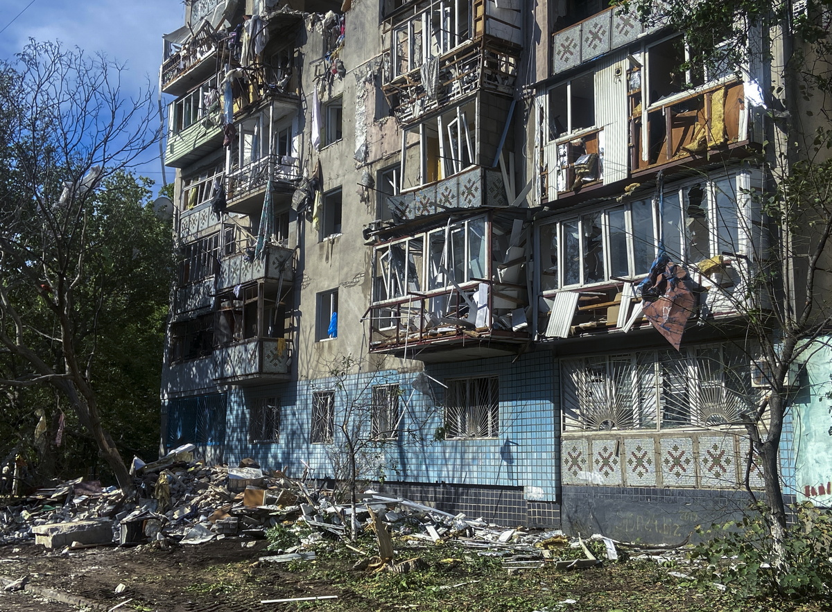 epa12258118 General view on damages from a drone strike at a residential building in Odesa, Ukraine, 24 July 2025, amid the Russian invasion. At least three people were injured after Russian forces attacked Odesa, the State Emergency Service (SES) of Ukraine reported. As a result of the attack the UNESCO-protected landmark Pryvoz market, a petrol station, a nine-storey residential building, and a private building were damaged. EPA/IGOR TKACHENKO
