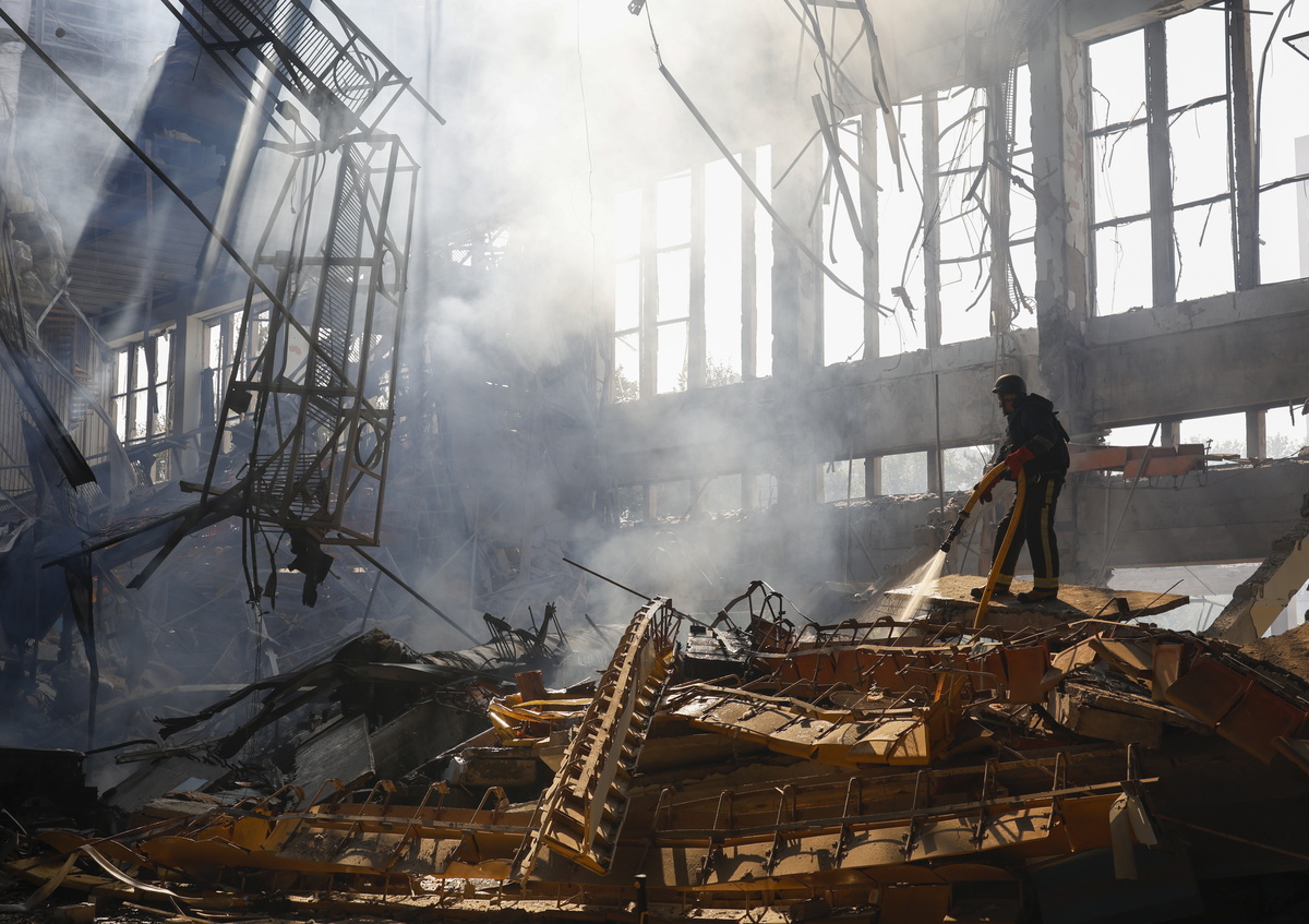 epa11577853 Ukrainian rescuers work at the site of a rocket strike on a sports complex in Kharkiv, northeastern Ukraine, 01 September 2024, amid the Russian invasion. At least 40 people have been injured, including five children, after a Russian rocket attack hit several civilian sites in Kharkiv, the head of the Kharkiv Military Administration Oleg Synegubov wrote on telegram. Russian troops entered Ukrainian territory on 24 February 2022, starting a conflict that has provoked destruction and a humanitarian crisis. EPA/SERGEY KOZLOV
