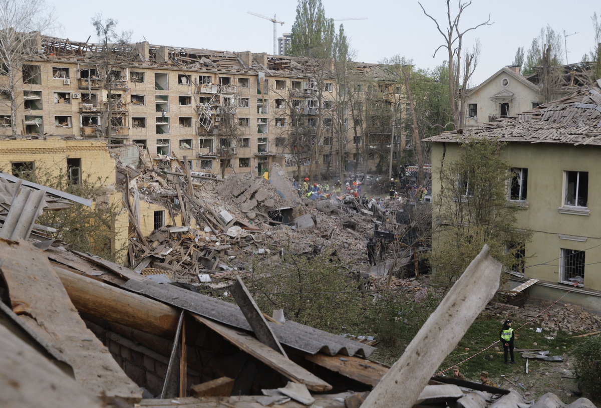 epa12050895 Ukrainian rescuers work at the site of a rocket strike that hit a residential building in Kyiv, Ukraine, 24 April 2025, amid the ongoing Russian invasion. Russia launched a large-scale overnight attack using a combination of drones and various types of rockets. At least nine people were killed and 63 others injured, including six children, in the strike on the residential building, according to the State Emergency Service report. EPA/SERGEY DOLZHENKO