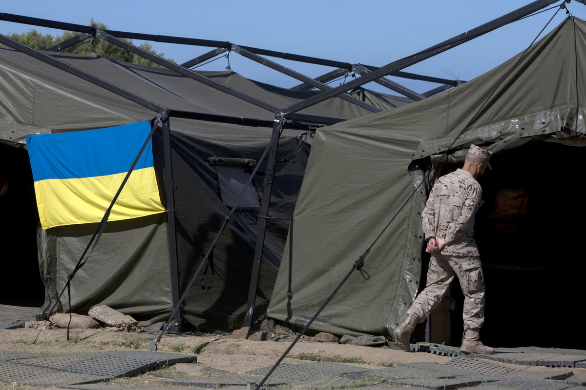 epa11345539 A Ukrainian flag hangs on a tent of Ukrainian soldiers at the Sierra del Retin training camp of the Spanish Army in Barbate town, Cadiz province, southern Spain, 16 May 2024. A group of 80 Ukrainian military personnel get in this camp basic military instruction, from combat shooting to throwing grenades from trenches, within the framework of the Military Assistance Mission of the European Union in Support of Ukraine (EUMAM UA). EPA/ROMAN RIOS