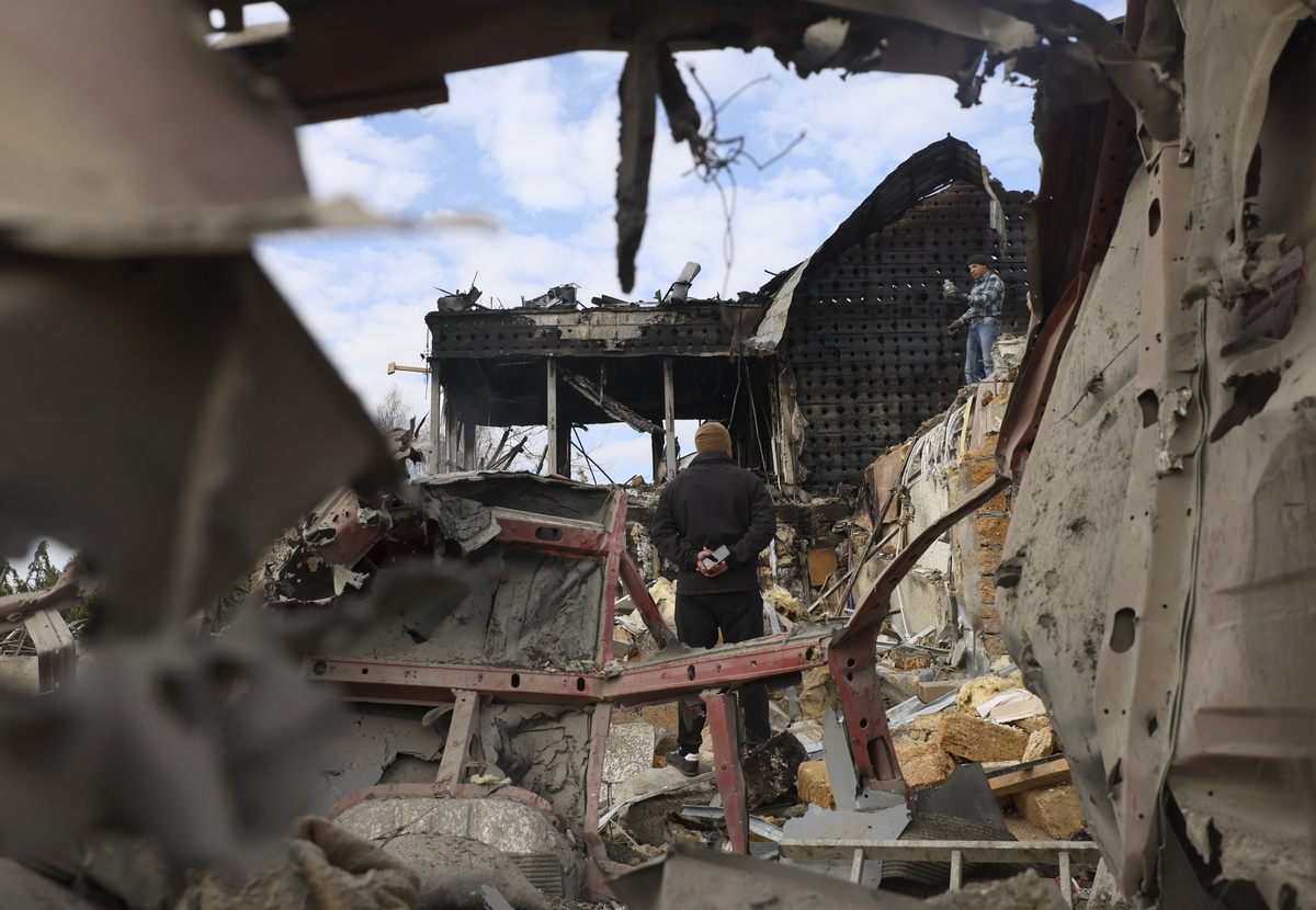epa11977908 Local residents inspect the damage following an overnight glide bomb attack on the village of Nyzhnia Khortytsia, in Zaporizhzhia region, Ukraine, 21 March 2025 amid the ongoing Russian invasion. According to the National Police of Ukraine at least six people, including a four-year-old child, were injured as a result of the attack late on 20 March. EPA/OLEG MOVCHANIUK
