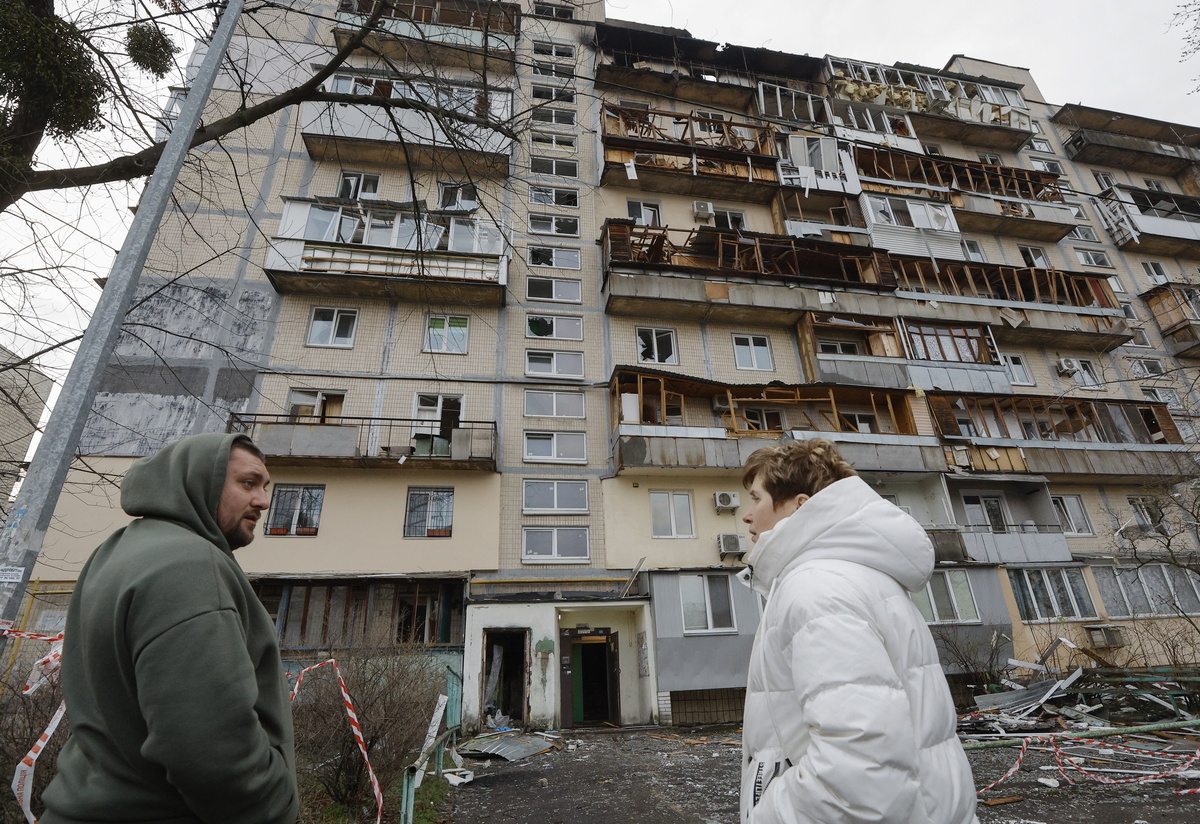 epa11982485 Ukrainians inspect the site of an overnight drone attack on a nine-story residential building in Kyiv, Ukraine, 23 March 2025 amid the ongoing Russian invasion. At least three people were killed an another 8 were injured in an overnight Russian drone attack in Ukraine according to the Ukrainian army and the State Emergency Services. EPA/SERGEY DOLZHENKO