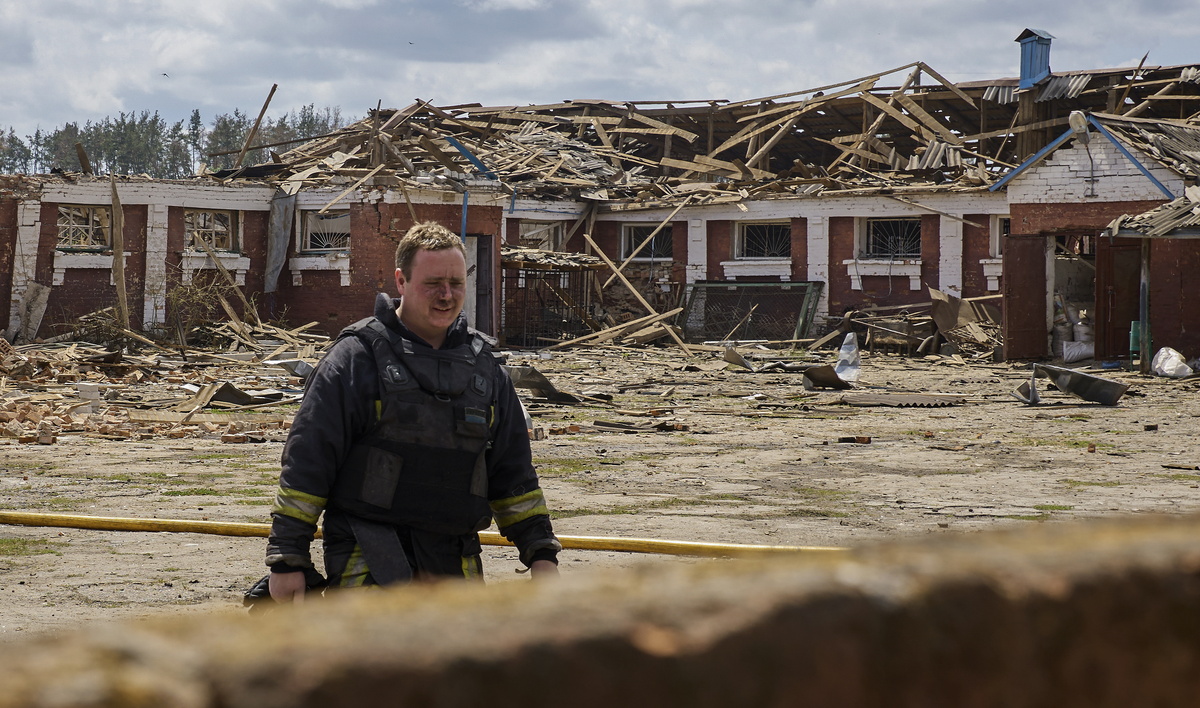 epa11379752 Ukrainian rescuers work at a site of a rocket hit to the riding hall of the Equestrian Center of the Veterinary Academy in Mala Danylivka village near Kharkiv, Ukraine, 30 May 2024 amid the Russian invasion. The Kharkiv Veterinary Academy was founded in 1804 and its Equestrian Center is a historical building. Nobody was killed or injured during the attack according to the report of the head of the Kharkiv Military Administration Oleg Synegubov. Russian troops entered Ukrainian territory on 24 February 2022, starting a conflict that has provoked destruction and a humanitarian crisis. EPA/SERGEY KOZLOV