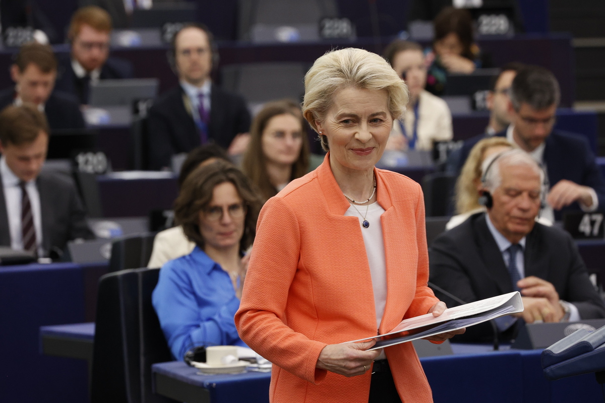 epa10577987 European Commission President Ursula von der Leyen during a session on 'The need for a coherent strategy for EU-China Relations' at the European Parliament in Strasbourg, France, 18 April 2023. The session of the European Parliament runs from 17 till 20 April. EPA/JULIEN WARNAND