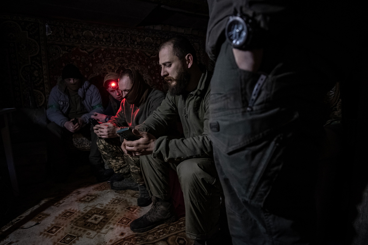 epa11902459 Soldiers from the Joint Assault Brigade 'Lyut', part of the Ukrainian National Police, at their position on the Toretsk front line, Donetsk region, Ukraine, 16 February 2025 (issued 17 February 2025). The brigade, formed by merging several police units that had been working in Donbas since 2014, uses Vampire drones to carry out attacks, as well as drop supplies on Ukrainian positions. The Vampire - nicknamed Baba Yaga by Russian troops - is a Ukrainian-made drone capable of remotely carrying out attacks with up to 15 kilograms of explosive. EPA/MARIA SENOVILLA