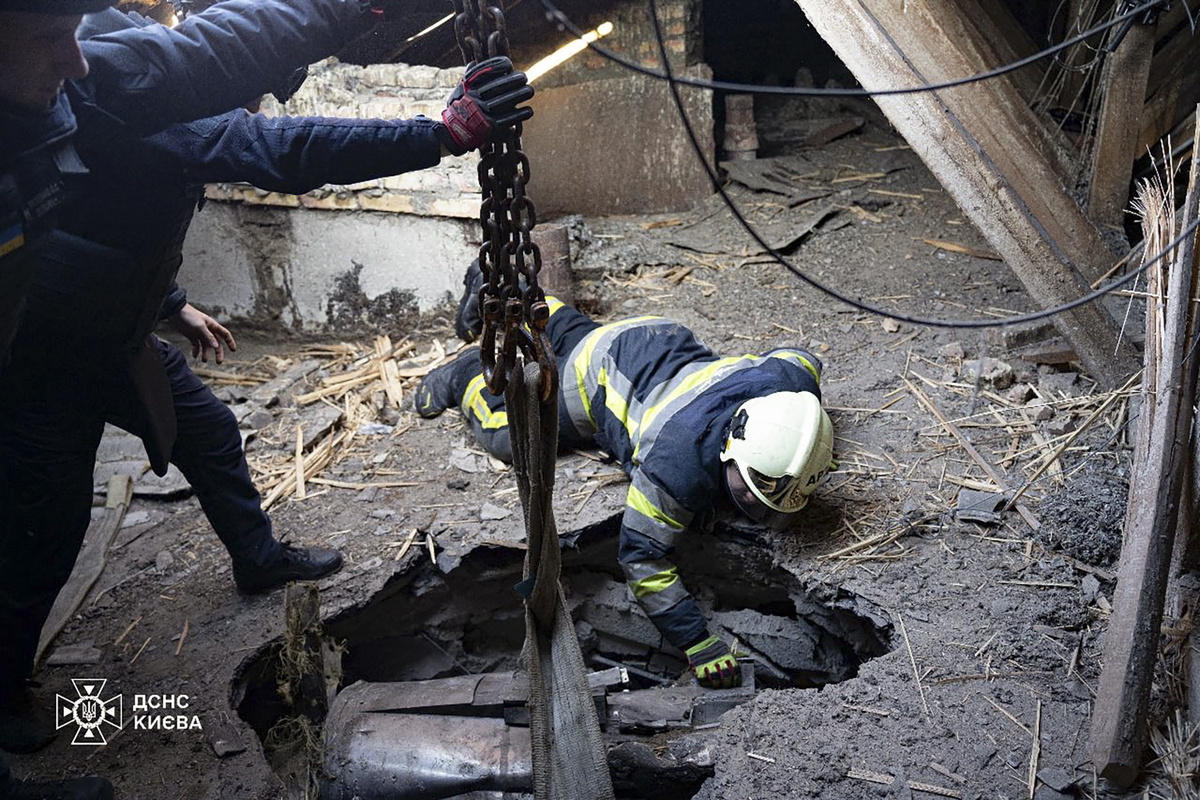 epa11725540 A handout photo released by the press service of the State Emergency Service (SES) of Ukraine shows Ukrainian rescuers removing debris of a rocket at the site of a damaged residential building in Kyiv, Ukraine, 17 November 2024. Russian forces launched a 'massive combined attack that targeted all regions of Ukraine' overnight and in the morning with around 120 missiles and 90 unmanned aerial vehicles (UAVs), Ukrainian President Zelensky said on 17 November, adding that Ukraine's air defense forces destroyed more than 140 air targets. The main target of the Russian attack was the energy infrastructure across Ukraine, Zelensky said. Russian troops entered Ukrainian territory on 24 February 2022, starting a conflict that has provoked destruction and a humanitarian crisis. EPA/STATE EMERGENCY SERVICE OF UKRAINE HANDOUT -- BEST QUALITY AVAILABLE -- MANDATORY CREDIT: STATE EMERGENCY SERVICE OF UKRAINEHANDOUT EDITORIAL USE ONLY/NO SALES