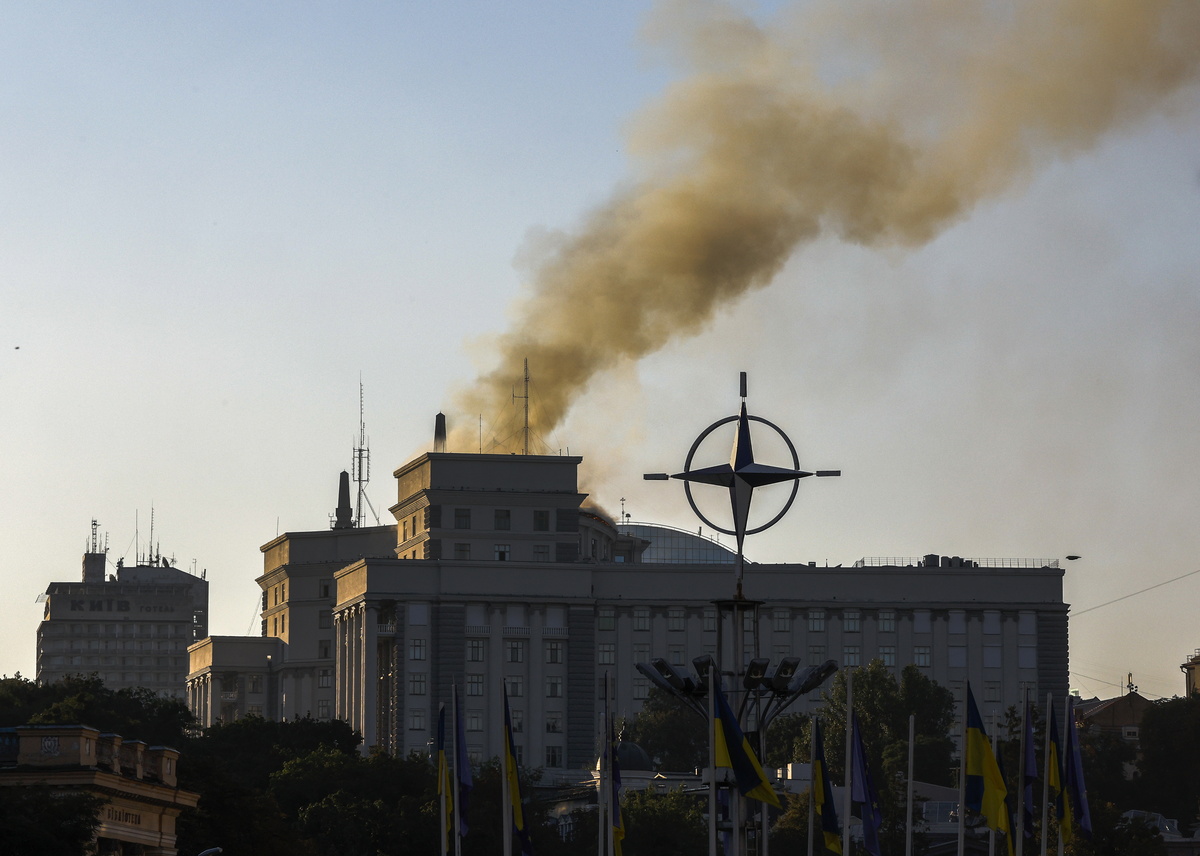 epa12358966 Smoke rises over the buildings housing Ukraine's cabinet in central Kyiv, Ukraine, 07 September 2025, amid the Russian invasion. At least two people were killed, including a child, and dozens were injured after Russian forces launched an overnight attack over Ukraine with more than 800 drones and 13 missiles, according to the State Emergency Service of Ukraine. EPA/SERGEY DOLZHENKO