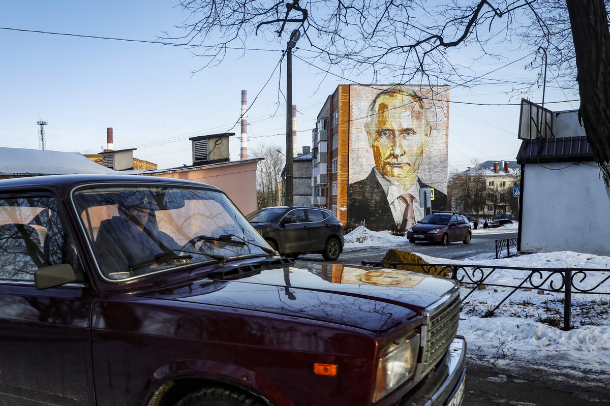 epa10401675 A man drives a VAZ-2107 Zhiguli (LADA 2107) past a large mural depicting Russian President Vladimir Putin, on the side of a five-story residential building in Kashira, Moscow region, Russia, 12 January 2023. The years-old mural was created by activists of the pro-Kremlin movement Molodaya Gvardiya (Young Guard). EPA/YURI KOCHETKOV