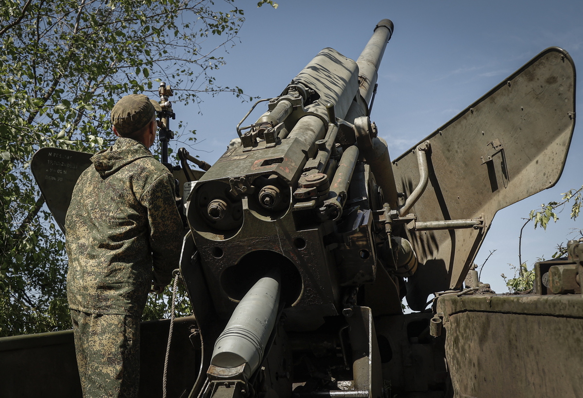 epa09992326 Self-proclaimed Donetsk People's Republic (DPR) militia prepare to fire a 2A36 Giatsint-B, a Soviet/Russian towed 152 mm field gun, on the frontline near Avdiivka, Donetsk region, eastern Ukraine, 02 June 2022. On 24 February Russian troops had entered Ukrainian territory in what the Russian president declared a 'special military operation', resulting in fighting and destruction in the country and a humanitarian crisis. EPA/ALESSANDRO GUERRA