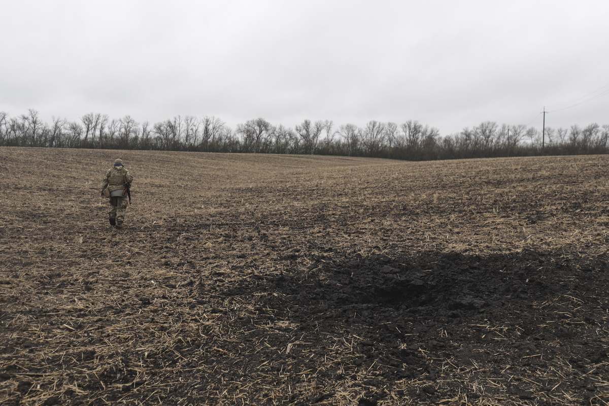 epa09899649 A Ukrainian serviceman walks on a field with a shelling hole in the Kharkiv area, Ukraine, 20 April 2022. The city of Kharkiv, Ukraine's second-largest city, has witnessed repeated airstrikes from Russian forces including satellite cities. Russian troops entered Ukraine on 24 February resulting in fighting and destruction in the country and triggering a series of severe economic sanctions on Russia by Western countries. EPA/STR