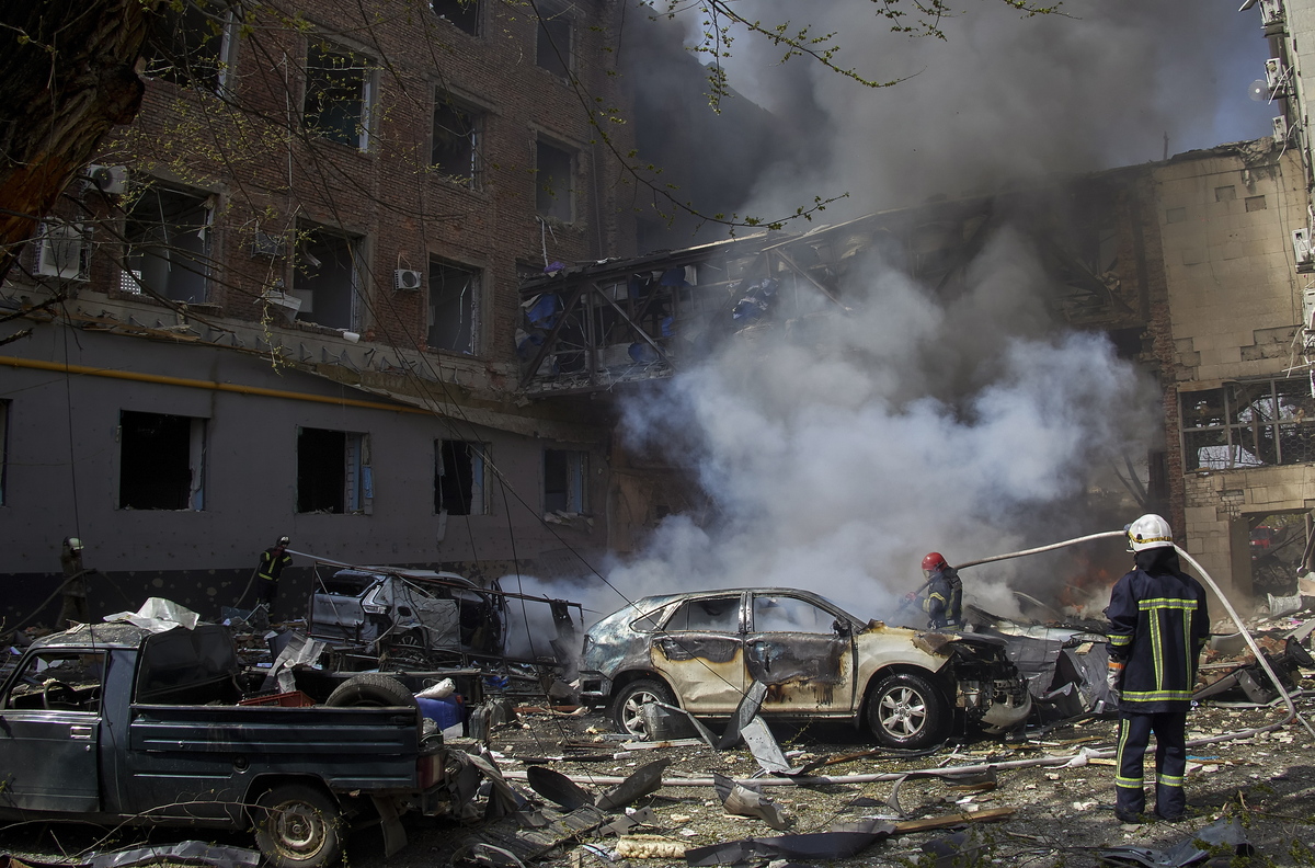 epa09893660 Ukrainian firefighters work at a damaged residential area following a Russian shelling in Kharkiv, Ukraine, 16 April 2022. Kharkiv, Ukraine's second-largest city, and its surroundings have been heavily shelled by Russian forces since the invasion began on 24 February 2022. EPA/SERGEY KOZLOV