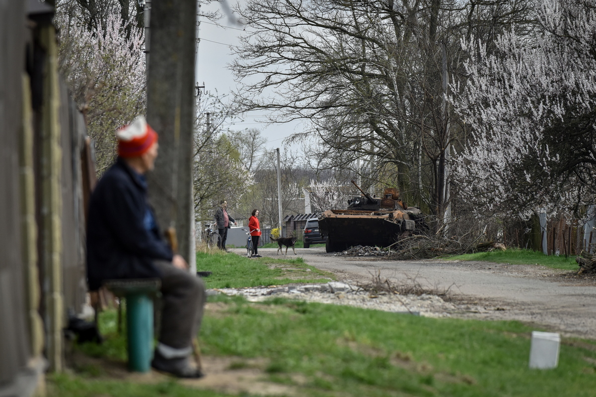 epa09908820 People look on destroyed Russian APC in recaptured by the Ukrainian army Rusaniv village of Kyiv area, Ukraine, 25 April 2022. Russian troops entered Ukraine on 24 February resulting in fighting and destruction in the country, and triggering a series of severe economic sanctions on Russia by Western countries. EPA/OLEG PETRASYUK