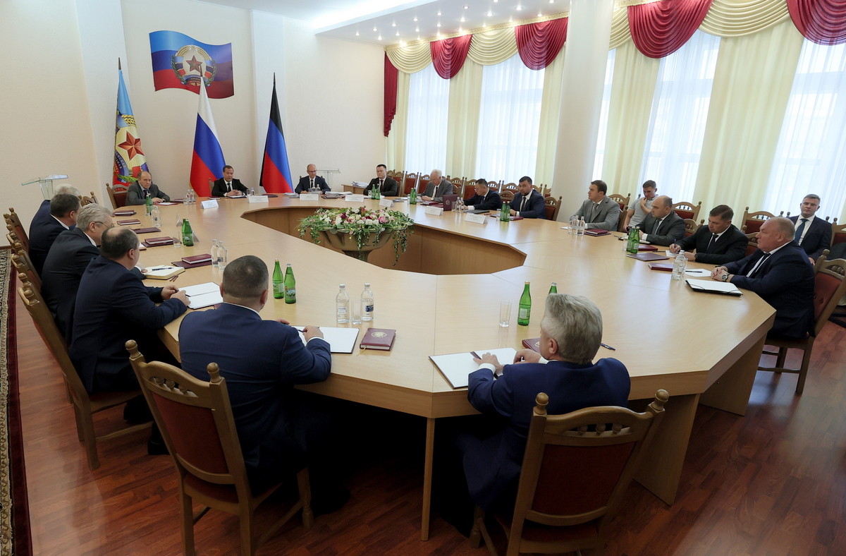 epa10116832 Deputy head of Russia's Security Council and chairman of the United Russia party, Dmitry Medvedev (C, rear) chairs a meeting on priority security measures of the Donbas region, in Luhansk, self-proclaimed Luhansk People's Republic (LPR), Ukraine, 11 August 2022 (issued 12 August 2022). Russian Defense Minister Shoigu on 04 July 2022 reported to Russian President Putin that the Russian Armed Forces and the People's Militia of the self-proclaimed Luhansk People's Republic (LPR) established full control over the territories of the self-proclaimed LPR within the administrative boundaries of the Luhansk region. EPA/SPUTNIK POOL / POOL