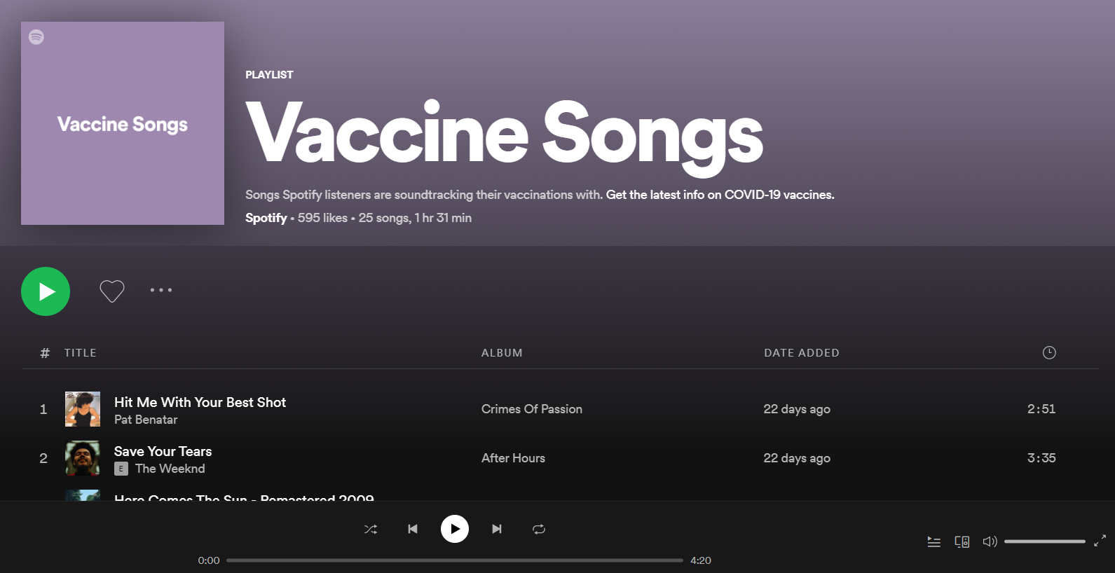 Η υπηρεσία ψηφιακής μουσικής Spotify δημοσίευσε πρόσφατα μία νέα επιμελημένη playlist που φέρει τον τίτλο «Vaccine Songs» (Τραγούδια Εμβολίου) με την ελπίδα οι ακροατές να ακούν τα τραγούδια της όταν γιορτάζουν τον εμβολιασμό τους κατά της Covid-19.